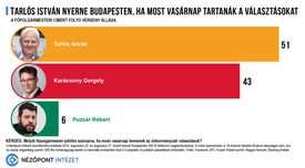Tarlós István nyerne Budapesten, ha most vasárnap tartanák a választásokat. A jelenlegi főpolgármester 51, Karácsony Gergely 43, Puzsér Róbert pedig a biztos szavazó fővárosiak 6 százalékának támogatásában bízhat. A Budapesten élők 62 százaléka szerint a főpolgármester-jelöltek közül Tarlós István képes leginkább arra, hogy a legtöbb pénzügyi forrást megszerezze Budapestnek a jövőben – derül ki a Nézőpont Intézet Magyar Nemzet számára készített, reprezentatív közvélemény-kutatásából.