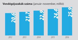 A KSH legfrissebb adatai szerint 2016. január–novemberben az előző év azonos időszakához képest a szálláshelyek 6,5 százalékkal több, összesen 25,9 millió vendégéjszakát regisztráltak. A külföldi vendégek 6 százalékkal (13 millió), a belföldiek 7 százalékkal több (szintén 13 millió) vendégéjszakát töltöttek a kereskedelmi szálláshelyeken. A szállodák szobakihasználtsága átlagosan 2,2 százalékponttal, 57 százalékra emelkedett. Összességében a kereskedelmi szálláshelyek – folyó áron összesen 8,6 százalékkal magasabb – 371,5 milliárd forint bruttó árbevételt értek el. A vendégforgalom növekedése az elmúlt években rendkívül egyenletes volt, 2012 óta évről évre egy-másfél millióval több vendég érkezik.