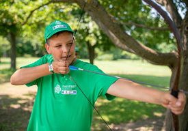 A parttól kissé távolabb, a hűs árnyat adó lombos fák között a Bács-Kiskun vármegyei jánoshalmai gyermekek ismerkednek az íjászattal, amire otthon nemigen adódik lehetőségük.