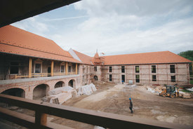 A kastély U alakú belső udvarán most még egymás hegyén-hátán hevernek az építkezés kellékei, de hamarosan ez is megváltozik.