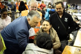 Orbán Viktor miniszterelnök (b) látogatást tesz a budapesti BOK csarnokban létesített humanitárius tranzitponton 2022. március 22-én. MTI/Miniszterelnöki Sajtóiroda/Fischer Zoltán