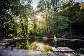 A tavacskákhoz a Telgárthy-rét zöldje mellett futó erdei út mentén sétálunk fel, a lépcsőzetesen, egymás alatt fekvő, mesterségesen kialakított tavakban nyüzsögnek a pisztrángok. A víz mellett húzódó erdősáv alján, a Pilisből eredő, hűvös vizű Apátkúti-patakban egyébként őshonos sebes pisztrángok élnek, ezeket kifogni azonban tilos, lévén védett állatok. Mindenesetre jelenlétük jól mutatja, hogy a pilisi erdő klímája, fekvése és tisztasága ideális hely e halfajta nevelésére. Az étterem kezelésében lévő tavacskákból a szivárványos pisztrángokat azonban ki lehet fogni, sőt, a hobbihorgászok által pecázott példányokat a helyi étteremben – kérésre – akár el is készítik. A fajtaválasztás egyáltalán nem véletlen: tavi körülmények között a szivárványos pisztráng szépen fejlődik, és sokkal gyorsabban nő, mint őshonos társa.