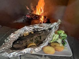 Szabó Gábor hozzáteszi, hogy már a kezdetektől pisztrángközpontú volt az étlap, ám mivel az erdő közepén üzemelnek, a vadhúsból, erdei gombából álló fogások is népszerűek. Ám a hal az igazi szenzáció, amit roston sütve vagy akár melegfüstöléssel is választható. Ez utóbbi annyiban különbözik a hideg füstöléssel végzett tartósítástól, hogy a hal nem kap kifejezetten füstös ízt, csupán kellemes aromát. A hetvenfokos meleg füsttel átjárt halhús kissé átfő, míg a hideg eljárásnál a besózást követően teszik a füstre a halhúst, ami szinte kiszárad, viszont jóval tovább eláll.