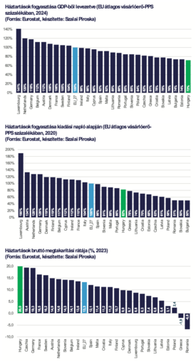 Az Eurostat szerint 2023-ban a magyar háztartások a rendelkezésükre álló jövedelmük húsz százalékát megtakarították, amivel az élen állunk, míg az uniós átlag 13,3 százalék. Szalai Piroska szerint ezt a számot is sokan félreértelmezik, miszerint csak a leggazdagabbak tudnak félretenni. Felhívta a figyelmet arra, hogy megtakarítása nem csak a felső tízezernek van, hiszen jelenleg már ott tartunk, hogy még a pályakezdők közül is sokan megpróbálnak félretenni, például nagyon jól jövedelmező állampapírokat vásárolni, hogy megalapozzák első saját lakásukat. 2010-ben az állampapírok mindössze három százaléka volt lakossági kézben, ma ez az arány meghaladja a húsz százalékot. Szalai Piroska úgy látja: ugyanilyen kulcsfontosságú tényező, hogy a magyar háztartások az energiaár-emelkedés hatására tömegesen kezdtek korszerűsítési beruházásokba.