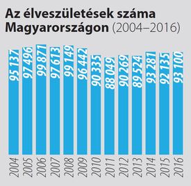 A Központi Statisztikai Hivatal szerint 2016-ban 93 100 gyermek jött világra, másfél százalékkal, vagyis 965-tel több, mint 2015-ben. A születésszám az első fél évben csak két hónapban, a második fél évben azonban mindegyikben felülmúlta az egy évvel korábbit, a legjelentősebb, 8,3 százalékos emelkedést októberben regisztrálták. Az elhunytak száma 126 900 fő volt, ami 3,6 százalékkal kevesebb, mint 2015-ben. A születések emelkedése és a halálozások visszaesése miatt a természetes fogyás a 2015. évi 40 007-tel szemben 2016-ban – 16 százalékkal – 33 800 főre csökkent. Így Magyarországon a tavalyi év végén 9 millió 799 ezren éltek.