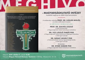 A sorozatot fölvezető Trianon Nagy Háború alatti előzményei, az Osztrák-Magyar Monarchia bukása 1914-1918 című monográfia emelkedett bemutatója október 2-án 16 órakor lesz a Magyar Nemzeti Múzeum dísztermében (1088 Budapest, Múzeum körút 14-16.)