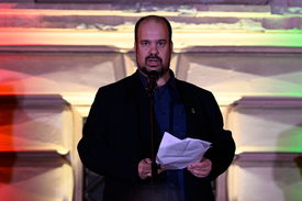 Rózsa András (Momentum), Zugló polgármestere beszédet mond a Momentum Mozgalom 1956-os megemlékezésén a Magyar Rádió egykori épülete előtt