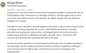 „Az Artemisszió Alapítvány ENSZ Menekültügyi Főbiztosságával (UNHCR) együttműködésben megvalósult projektjében lehetőségem nyílt arra, hogy mentorként és támogatóként segíthessem Zia Qasemit, egy afgán menekültet, aki Magyarországon akart beilleszkedni.”