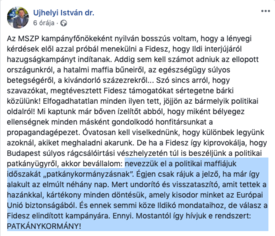 Ujhelyi István szerint nem az MSZP hozta be a közéletbe a patkányt mint jelzőt. A gyűlöletkampány „a Fidesz egyik legfontosabb fegyvere”, de szerinte ezt a fegyvert a kormánypárt most nem okosan használja, mert mostantól minden választónak a Fidesz Facebook-hirdetését nézve az fog eszébe jutni: „ez egy patkánykormányzás patkánykampánya”. Megjegyezte azt is, a Fidesz egymillió forintot költött a Facebookon „a hazug kampányra”.