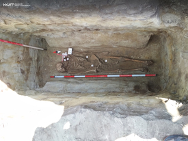 Esetünkben egy avar nő sírjára bukkantak a régészek. Az asszony 30-40 éves kora között halhatott meg, valamikor a VII. század közepén, csontozatán semmilyen sérülésre utaló – kardvágás, fejszecsapás, buzogány okozta zúzódás stb. – nyom nem található. Ahogy nem találhatók betegségre, például tüdőbajra utaló jelek sem. Összesen hét lelőhelyet fedeztek fel a régészek a beruházás nyomvonalában, amelyek szinte kivétel nélkül a római korra, a szarmaták idejére keltezhetők. Hogy az avar kori asszony maradványai igencsak jó állapotban vészelték át az eltelt 1400 évet, azzal magyarázható, hogy a test 260 centiméter mélyen feküdt a földben, ennélfogva senki, így tehát a rablók sem bolygatták meg. Természetesen a fából készült posztamens és az arra helyezett deszkakoporsó – mint ahogy minden textil, illetve szerves anyag – az idő martaléka lett. Csak a felépítmény tartóoszlopainak helye látható a sír négy sarkában.