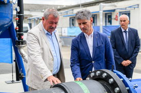V. Németh Zsolt, az Energiaügyi Minisztérium vízgazdálkodásért felelős államtitkára és Haranghy Csaba Ferenc, a Nemzeti Vízművek Zrt. vezérigazgatója a Dunántúli Regionális Vízmű Zrt. (DRV) Balatonszéplaki Felszíni Vízművénél korszerűsített víztisztító technológia műszaki átadásán Zamárdiban 2025. július 29-én