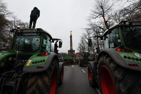 Tüntetõ gazdálkodók traktorokkal a berlini Június 17. úton, a háttérben a Gyõzelem oszlopa 2023. december 18-án.