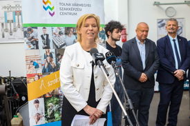 Varga-Bajusz Veronika, a Kulturális és Innovációs Minisztérium (KIM) felsőoktatásért, szak- és felnőttképzésért, fiatalokért felelős államtitkára sajtótájékoztatót tart a duális szakképzésről Pakson, a duális képzésben részt vevő fiatalokat foglalkoztató Ipsum-Tech Kft. és Gradum Kft. telephelyén 2025. szeptember 4-én