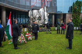 Varga Mihály nemzetgazdasági miniszter, Budapest II. és III. kerületének fideszes országgyűlési képviselője Láng Zsolttal, a II. kerület polgármesterével közösen helyezett el koszorút a Széna téri 1956-os emlékműnél.