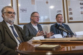 Sümeg, 2023. december 16. Navracsics Tibor területfejlesztési miniszter (k) beszél, mellette Végh László (Fidesz-KDNP) polgármester (b) és Boglár Tamás projektmenedzser a sümegi illegális hulladéklerakó felszámolásáról tartott sajtótájékoztatón és a projekt nyitórendezvényén Sümegen, a Ramassetter Látogatóközpontban 2023. december 16-án. Mintegy háromszázmillió forintos uniós támogatásból számolják fel az illegális hulladéklerakót, amelynek során a Kopaszhegyen egy csaknem 3200 négyzetméteres területen 15 ezer tonna hulladék kezelését végzik el a projekt keretében.