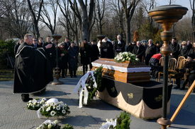 Budapest, 2023. február 10. Beer Miklós nyugalmazott váci megyés püspök (b) Mécs Imre 1956-os halálraítélt, a Szabad Demokraták Szövetségének egykori alapítótagja, volt országgyûlési képviselõ temetésén az Óbudai temetõben 2023. február 10-én. Mécs Imre életének 90. évében január 19-én hunyt el. Szemben középen Frölich Róbert országos fõrabbi, mellette jobbra Iványi Gábor lelkész, a Magyarországi Evangéliumi Testvérközösség (MET) elnöke és Donáth László evangélikus lelkész, volt szocialista párti parlamenti képviselõ.