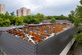 A drónnal készült képen egy bevásárlóközpont viharban megrongálódott tetőszerkezete Debrecenben 2025. július 7-én.