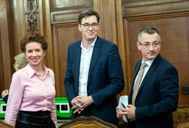 Tüttő Kata főpolgármester-helyettes, Karácsony Gergely főpolgármester (k) és Bolla Tibor, a BKV Zrt. elnök-vezérigazgatója a cég székházában 2020. február 25-én