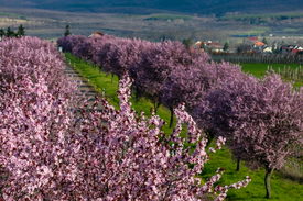 A drónnal készült felvételen virágzó vérszilvafák (Prunus cerasifera) Gyöngyöstarján közelében 2025. március 30-án.