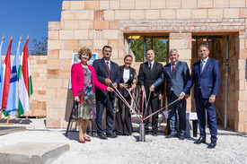Sifter Rózsa Zala vármegyei fõispán, Vigh László, a térség fideszes országgyûlési képviselõje, Vitályos Eszter, a Kulturális és Innovációs Minisztérium parlamenti államtitkára, Balaicz Zoltán polgármester, Domján István önkormányzati képviselõ és Pál Attila, a Zala Vármegyei Közgyûlés elnöke (b-j) az andráshidai városrészben épülõ minibölcsõde alapkõletételi ünnepségén Zalaegerszegen 2023. szeptember 7-én.