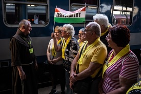 Böjte Csaba ferences rendi szerzetes, a Dévai Szent Ferenc Alapítvány alapítója (b) a Csíksomlyóra tartó zarándokvonat indulása előtt a budapesti Keleti pályaudvaron 2023. május 26-án. A vonat mintegy 400 zarándokot visz a csíksomlyói búcsúba
