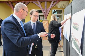 Zsigó Róbert, a Kulturális és Innovációs Minisztérium parlamenti államtitkára (b) és Szemán Ákos (Fidesz-KDNP) polgármester beszélget Taktaharkányban, ahol az államtitkár megtekintette a Taktaharkányi Szivárvány Óvoda és Bölcsőde bővítési munkálatait 2024. május 8-án