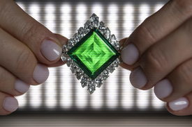 Bemutatják a Cartier francia ékszerház Aga kán nevú, 1960-ban készített smaragd és gyémánt ruhatűjét a Christie's aukciós ház genfi bemutatótermében 2024. november 7-én. A platinába és aranyba foglalt smaragdot 37 karátos, marquise csiszolású gyémántok fogják közre. A 49 milliméter oldalhosszúságú ékszert november 12-án árverezik el a Christie's genfi aukcióján