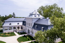 A drónnal készült képen a felújított geszti Tisza-kastély a sajtóbejárás és rendhagyó tárlatvezetés napján, 2024. június 27-én