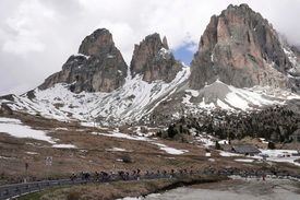 A mezőny a Sella-hágón kapaszkodik fel a 107. Giro d'Italia olasz országúti kerékpáros körverseny 17., Selva Val Gardena és Passo Brocon közötti 159 kilométeres szakaszán 2024. május 22-én