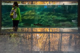Érdeklődő a vizes élőhelyeket bemutató Hal, Víz, Ember című kiállításon az „Egy a természettel” Vadászati és Természeti Világkiállításon a budapesti Hungexpón 2021. szeptember 29-én