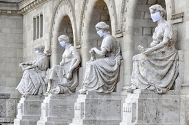 Maszk a Budapesti Műszaki és Gazdaságtudományi Egyetem (BME) központi épületének főbejáratánál álló, a technikai tudományokat ábrázoló allegorikus szoboralakok arcán az egyetem 239. tanévnyitó ünnepségének idején, 2020. szeptember 4-én