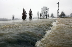 Sajóivánka, 2021. február 9. Víz hömpölyög a Sajó áradása miatt lezárt úton Sajóivánka és Sajókaza között 2021. február 9-én. Az áradás miatt a Putnok és Sajóvelezd közötti utat is lezárták.