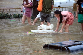 Csengcsou, 2021. július 21. Kutyáját tolja deszkán egy nõ az árvíz sújtotta kínai Csengcsou városban 2021. július 20-án. A heves esőzések következtében víz árasztotta el Honan tartomány székvárosának metróhálózatát, így emberek százai rekedtek a szerelvényekben, illetve az alagutakban. A természeti katasztrófának legkevesebb tizenkét halálos áldozata van.