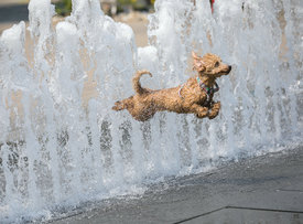 Kutya hűsíti magát egy szökőkút vizében a kánikulában a budapesti Szabadság téren 2020. augusztus 9-én