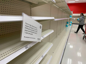 Korlátozott mennyiségű vásárlásra figyelmeztető felirat egy üres polcon a Kalifornia állambeli Fremont egyik áruházában 2020. november 24-én. A koronavírus miatt eltűntek az üzletekből a vécépapírok, a kézfertőtlenítők és más higiéniai árucikkek, valamint felvásárolták a tartós élelmiszereket. A koronavírusos megbetegedések számának gyors emelkedése miatt kijárási korlátozásokat léptettek életbe Kalifornia államban, hogy így előzzék meg az egészségügyi ellátórendszer megroggyanását. Az új szabályozás értelmében este tíz és hajnal öt között nem lehet az utcán senki, akinek nem abszolút halaszthatatlan elintéznivalója van. A korlátozás a jelenlegi tervek szerint december 21-ig lesz érvényben, és további szigorítások is várhatók, amennyiben a járványügyi adatok nem javulnak