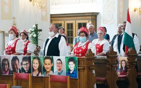 Fertőszentmiklósról érkezett hívők Reisz Péter Pál sümegi ferences házfőnök magyar nyelvű szentmiséjén, Nagyboldogasszony napján a burgenlandi kisváros, Boldogasszony (Frauenkirchen) bazilikájában 2020. augusztus 15-én.
