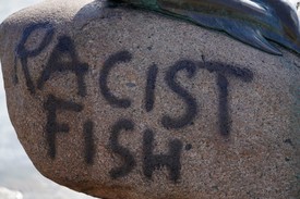 A „Rasszista hal” feliratot festették a dán főváros jelképévé vált Kis hableány szobrára a koppenhágai kikötő bejáratánál 2020. július 3-án.