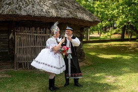 Barna Krisztina és Racs Gábor rimóci népviseletben a balassagyarmati Palóc Múzeum szabadtéri néprajzi gyűjteményének udvarán tartott esküvőjük után 2020. augusztus 7-én.