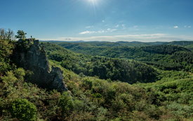 Sirok, 2022. július 11. A drónnal készített, több fotóból, számítógépes programmal összeállított panorámaképen a Törökasztal sziklaalakzat Sirokon 2022. július 11-én.