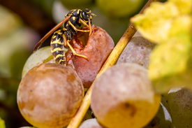 Nagykanizsa, 2021. szeptember 14. Szõlõszemet eszik egy darázs Nagykanizsa közelében 2021. szeptember 14-én.