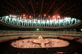 Tokió, 2021. július 23. Az olimpiai láng a XXXII. nyári olimpiai játékok nyitóünnepségén a tokiói Olimpiai Stadionban 2021. július 23-án. A világméretû koronavírus-járvány miatt 2021-re halasztották a 2020-as tokiói nyári olimpiát.