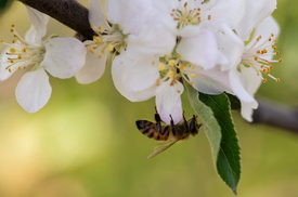 Újfehértó, 2021. május 12. Méh száll egy almavirágra a Debreceni Egyetem Újfehértói Kutatóintézetében 2021. május 12-én. A terméskezdemények fejlõdése folyamatos a szabolcsi almaültetvényekben, az áprilisi fagyos napok nem okoztak számottevõ fagykárt. A kora tavaszi kedvezõ idõjárás következtében az elmúlt tíz év legnagyobb almatermése várható Magyarországon, a becslések alapján 800 ezer tonna almára számítanak a nyár végi és az õszi szüreten.