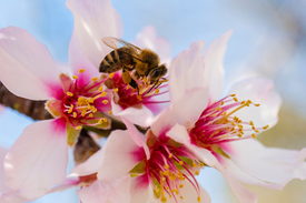 Pécs, 2021. március 3. Virágport gyûjt egy méh egy mandulafa virágáról 2021. március 3-án.