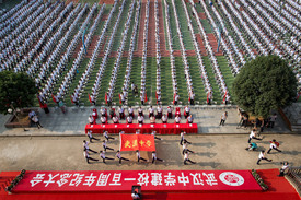 Diákok egy vuhani középiskola tanévnyitóján 2020. szeptember 1-jén. A korábban az egész világra kiterjedő koronavírus-járvány gócpontjának tartott Vuhanban mintegy 1,4 millió diák kezdi meg a tanévet.