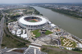 A drónnal készült felvételen a Nemzeti Atlétikai Központ 2023. augusztus 17-én, két nappal a budapesti atlétikai világbajnokság kezdete előtt. Magyarország történetének legnagyobb sporteseményét augusztus 19. és 27. között rendezik. A stadion előtt a Medál Pláza, ahol az éremátadások és koncertek, szórakoztató programok is lesznek, mellette a szurkolói zóna (j).