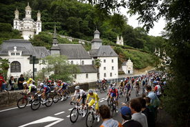 Az összetettben vezetõ sárga mezét viselõ Tadej Pogacar, az UAE Team Emirates szlovén címvédője és a mezőny Saint-Pe-de-Bigorre-ban a Tour de France francia országúti kerékpáros körverseny 14., Pau és Luchon-Superbagneres közötti 182,6 kilométeres szakaszán 2025. július 19-én