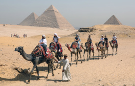 Turisták tevegelnek a gízai piramisoknál a turizmus világnapján, 2022. szeptember 27-én. Egyiptomban a múzeumok és a régészeti lelőhelyek ingyenesen látogathatóak ezen a napon