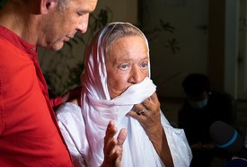 Sophie Pétronin francia segélymunkás (j) és fia, Sebastien Chadaud-Petronin nyilatkozik a sajtó képviselőinek, miután szabadon engedték Bamakóban 2020. október 9-én.