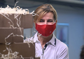 Herczegh Anita, a köztársasági elnök felesége a Magyar Máltai Szeretetszolgálat fogyatékossággal élő embereket foglalkoztató pátyi Teaműhelyében, ahol a szervezet „Adni öröm!” akciója önkénteseként karácsonyi ajándékokat csomagolt 2020. december 11-én