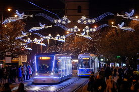 Fényfüzérekkel feldíszített adventi villamosok közlekednek Debrecenben 2022. december 15-én